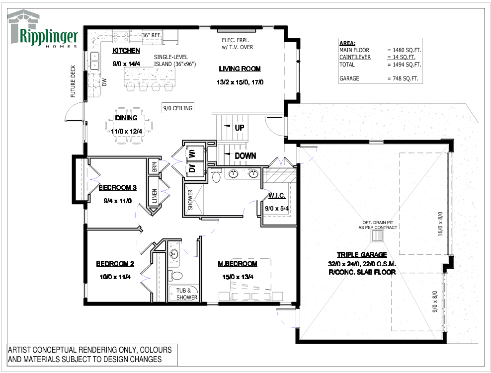 We are currently in the midst of building this wonderful 1495 sq ft bungalow. This home has a triple car garage, three bedrooms, two bathrooms, and an open concept living area, all situated on a large pie lot!